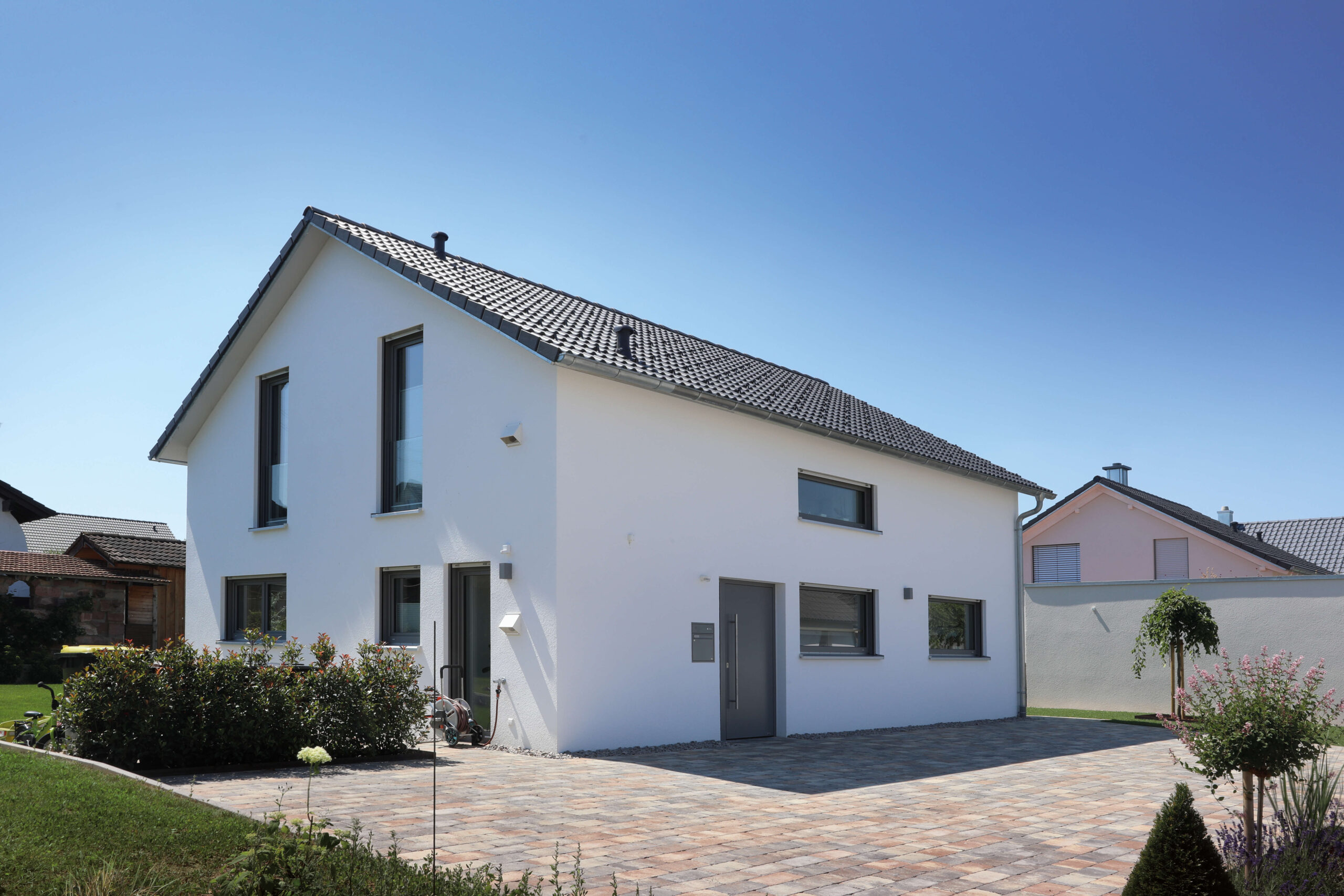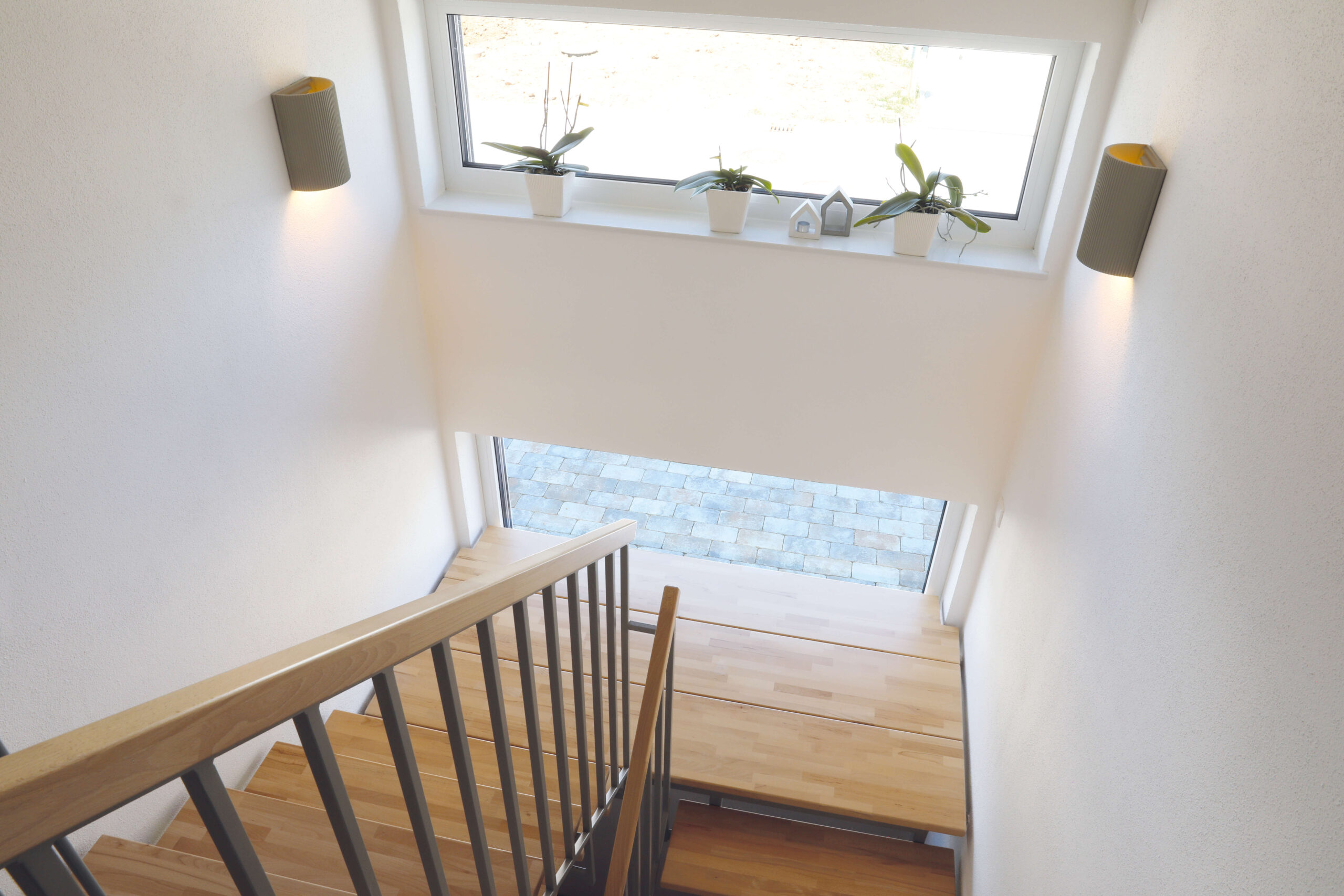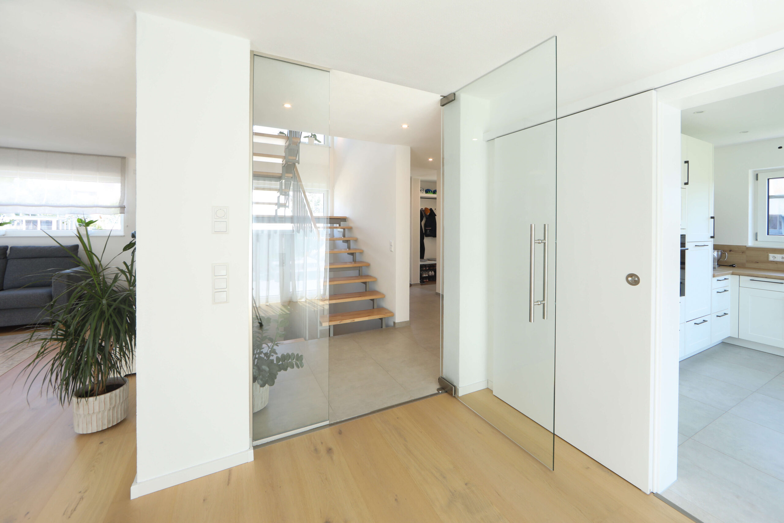Im Eingangsbereich des Einfamilienhauses angekommen verbindet ein großflächiges Glaselement den Flurbereich mit dem Wohnbereich, schenkt Transparent und lädt zum Hereinkommen und Wohlfühlen ein.