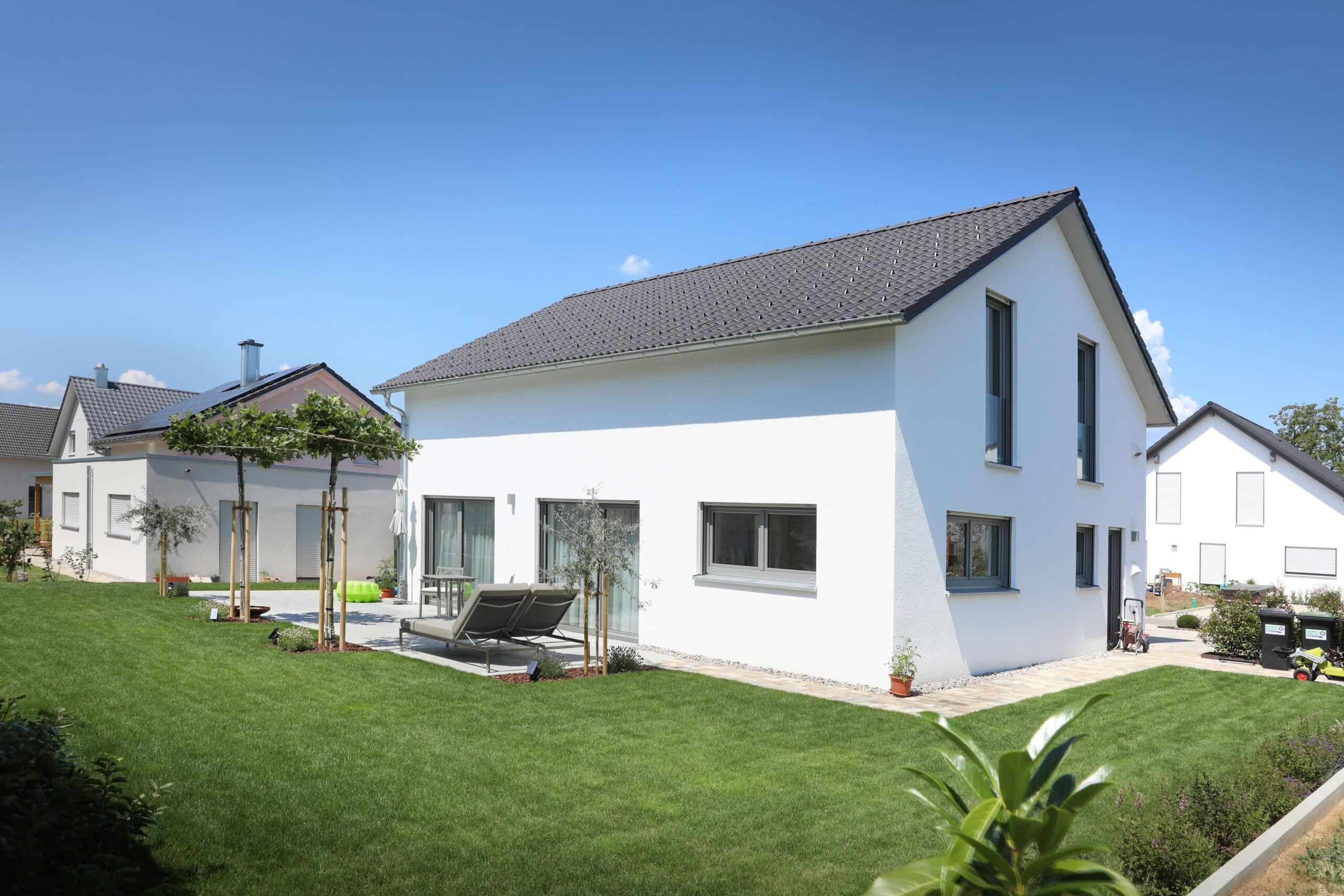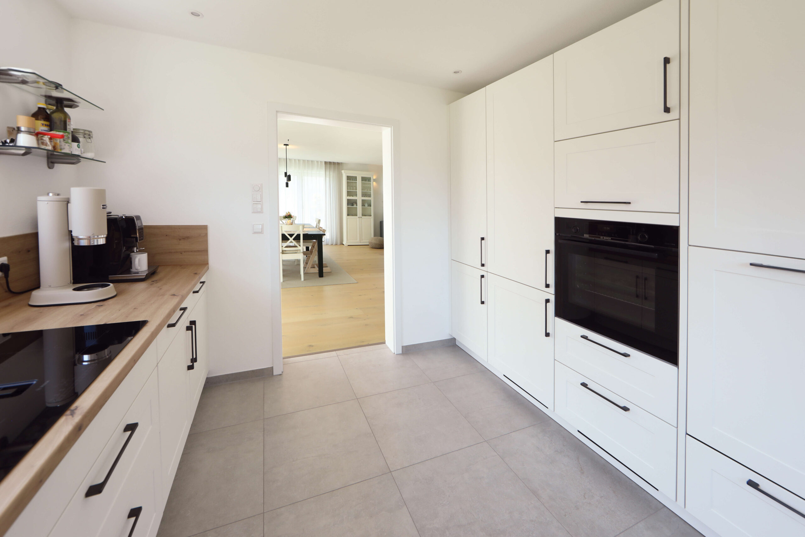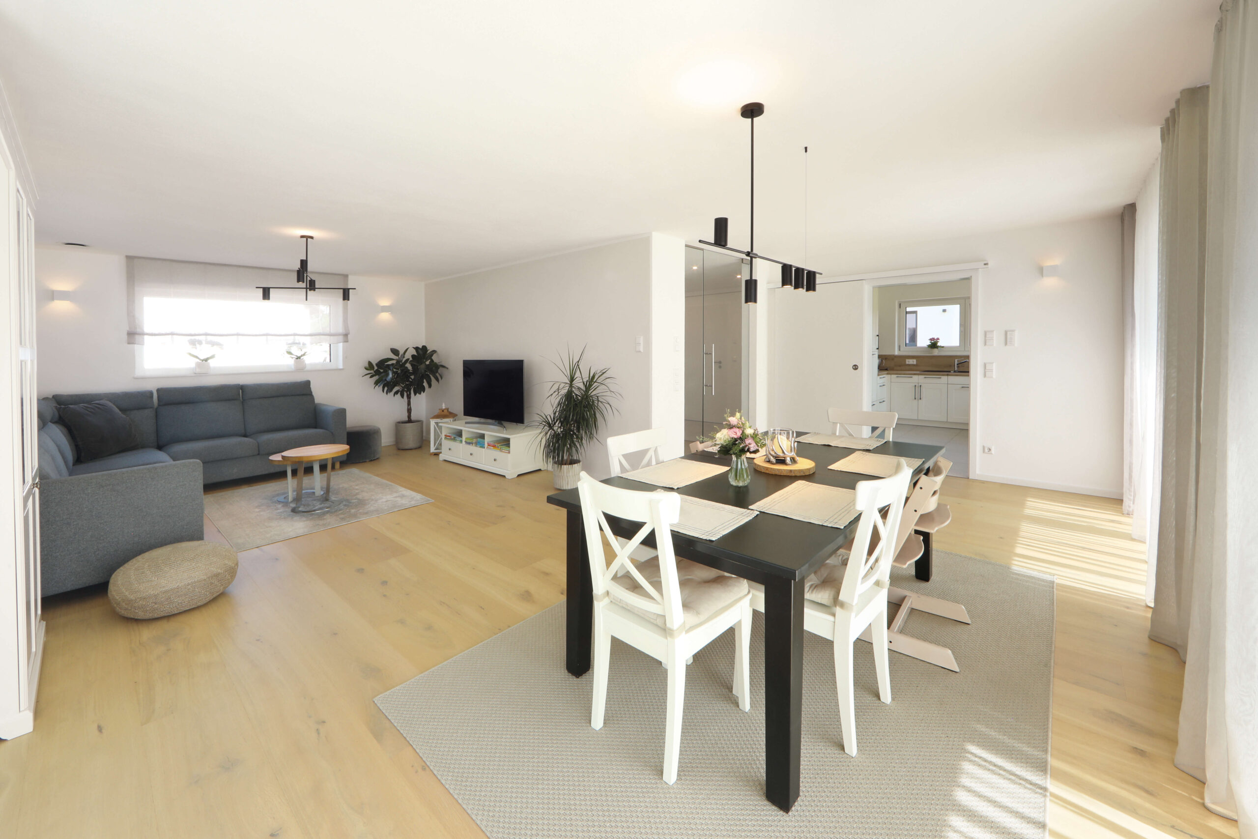 Durch eine dezent gehaltene Schiebetür kann die Küche kurzerhand vom offenen Ess- und Wohnbereich abgetrennt werden und verschwindet so komplett/praktisch aus dem Blickfeld. Bequem vom Wohnbereich aus zu erreichen ist die Terrasse und der Garten, welche zum Entspannen in der Natur einladen.