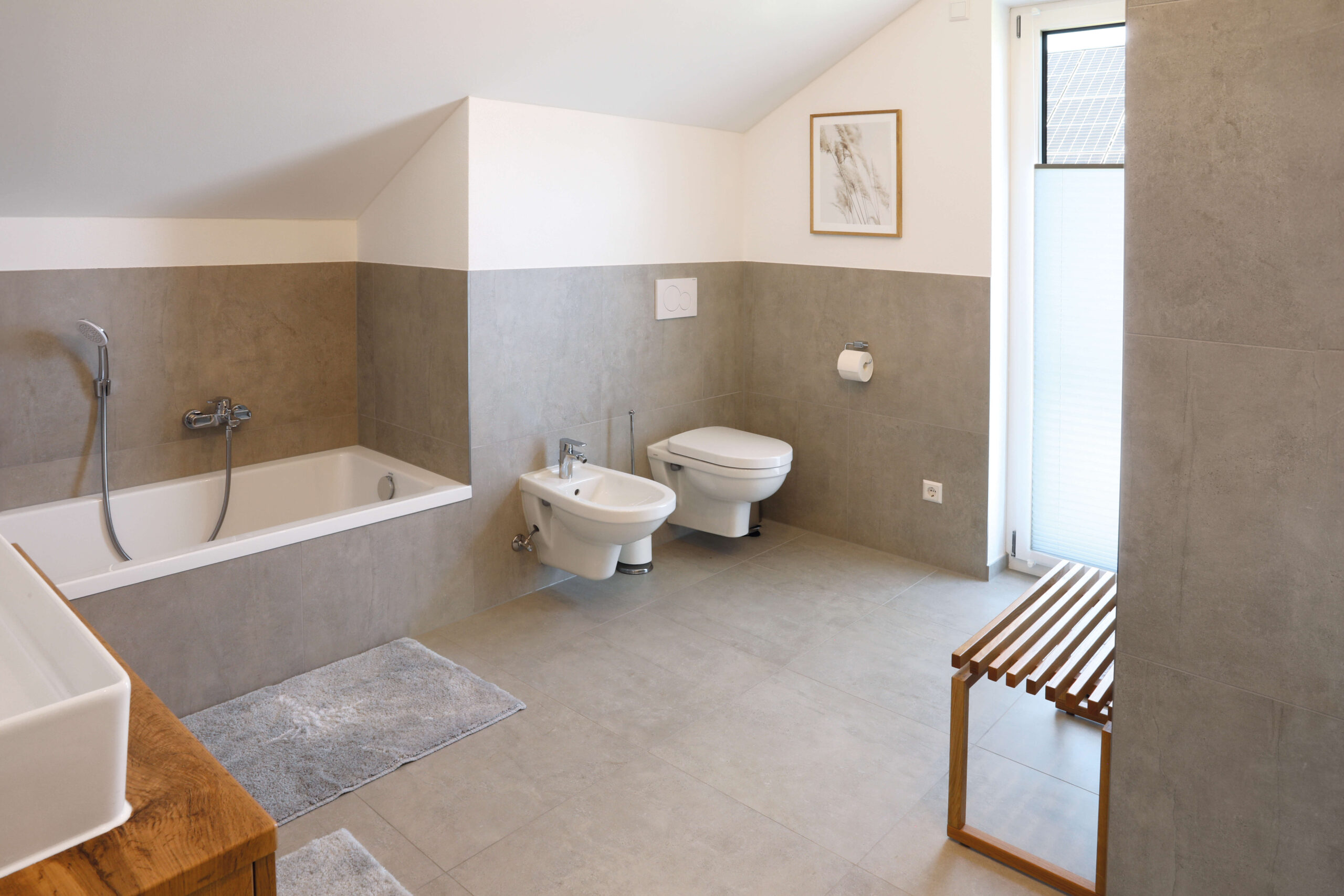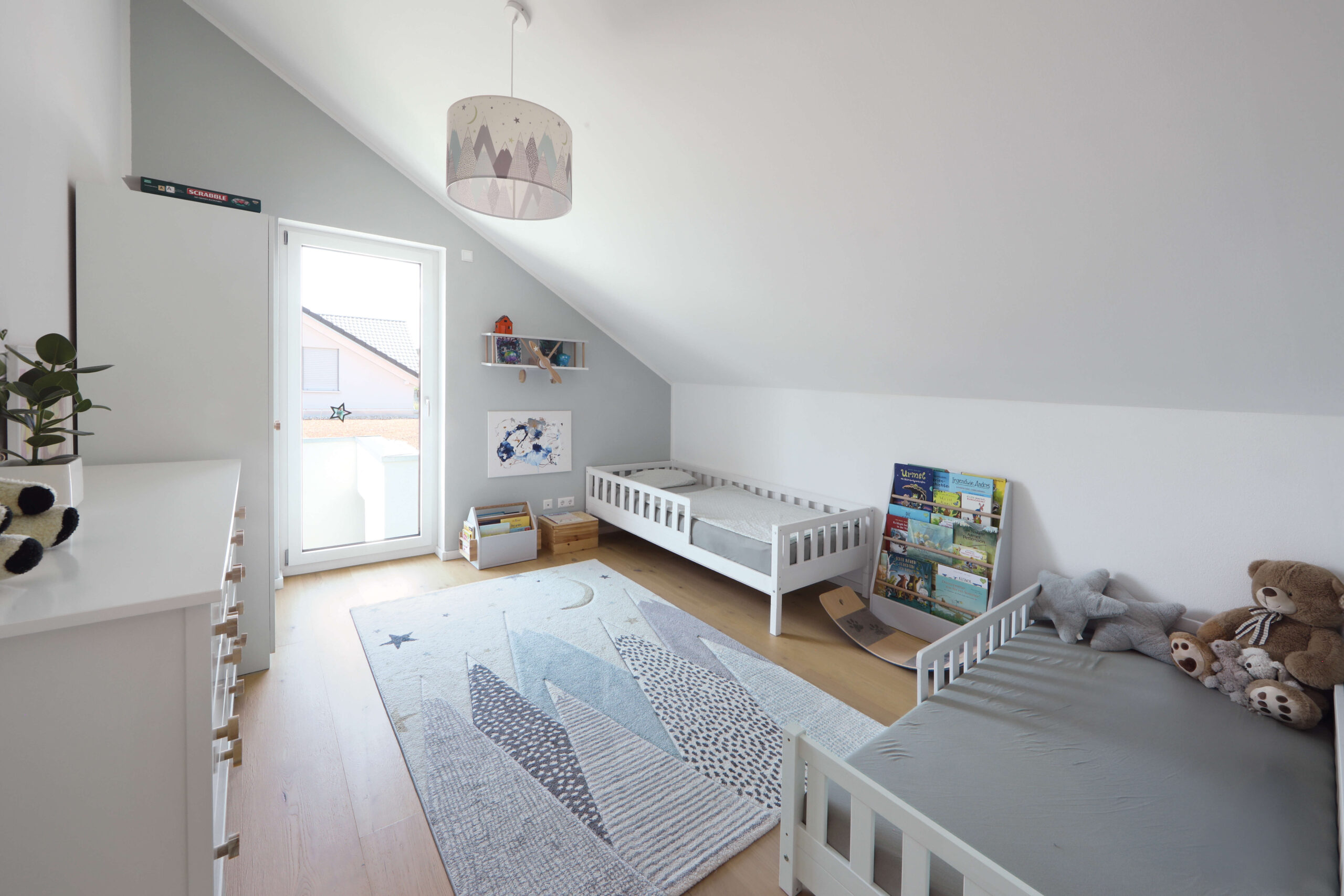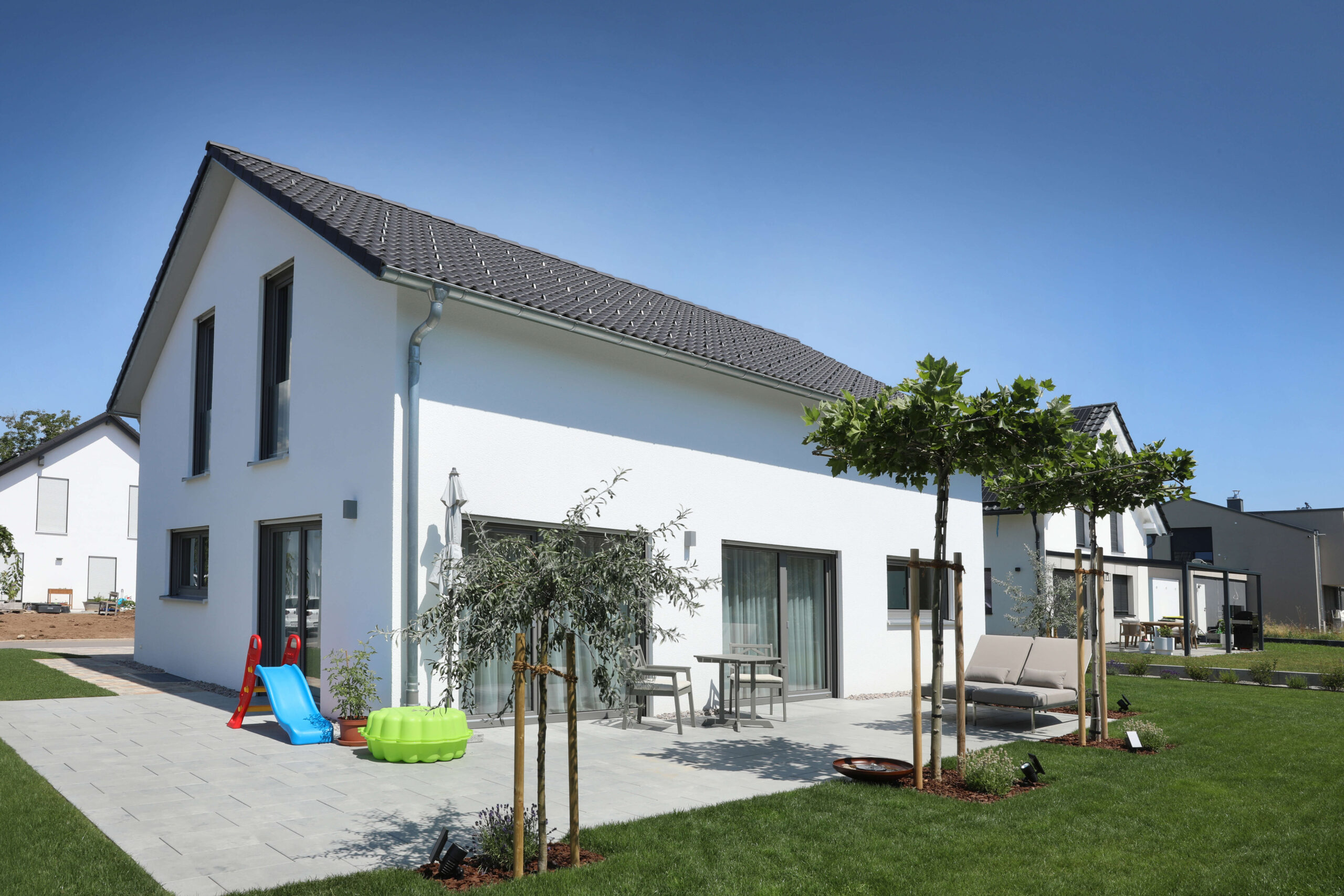 Durch eine dezent gehaltene Schiebetür kann die Küche kurzerhand vom offenen Ess- und Wohnbereich abgetrennt werden und verschwindet so komplett/praktisch aus dem Blickfeld. Bequem vom Wohnbereich aus zu erreichen ist die Terrasse und der Garten, welche zum Entspannen in der Natur einladen.